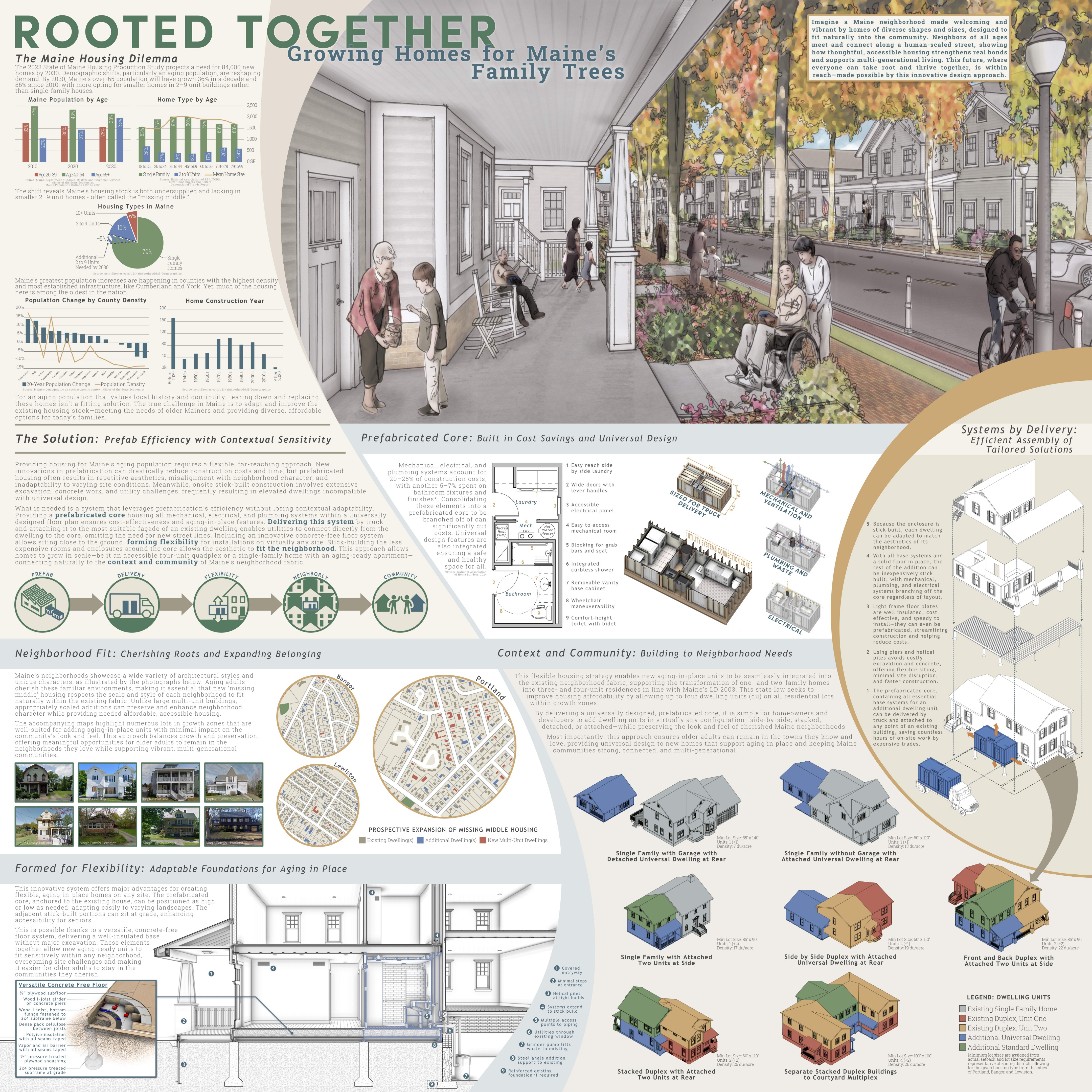 Aging-in-place housing is critical in Maine, where a rapidly growing older population wants to stay rooted in familiar neighborhoods but faces a shortage of smaller, accessible options that fit existing community character. Rooted Together responds by pairing a universally designed, prefabricated core—containing all mechanical, electrical, and plumbing systems—with a concrete-free floor system and simple, stick-built enclosures, making it easier and more affordable to add new dwelling units to existing homes in ways that respect each neighborhood’s scale and style.